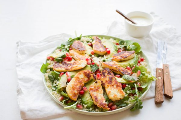 7. Halloumi salade met quinoa, avocado en granaatappel
