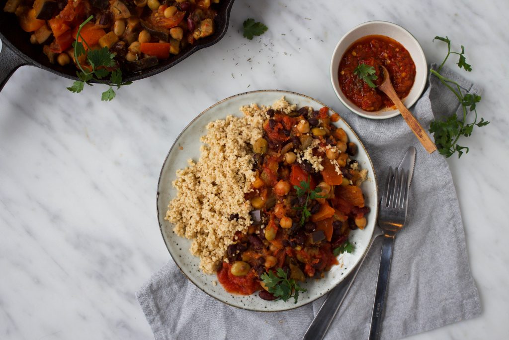 15. Aubergine-zoete aardappel schotel met kikkererwten en harissa