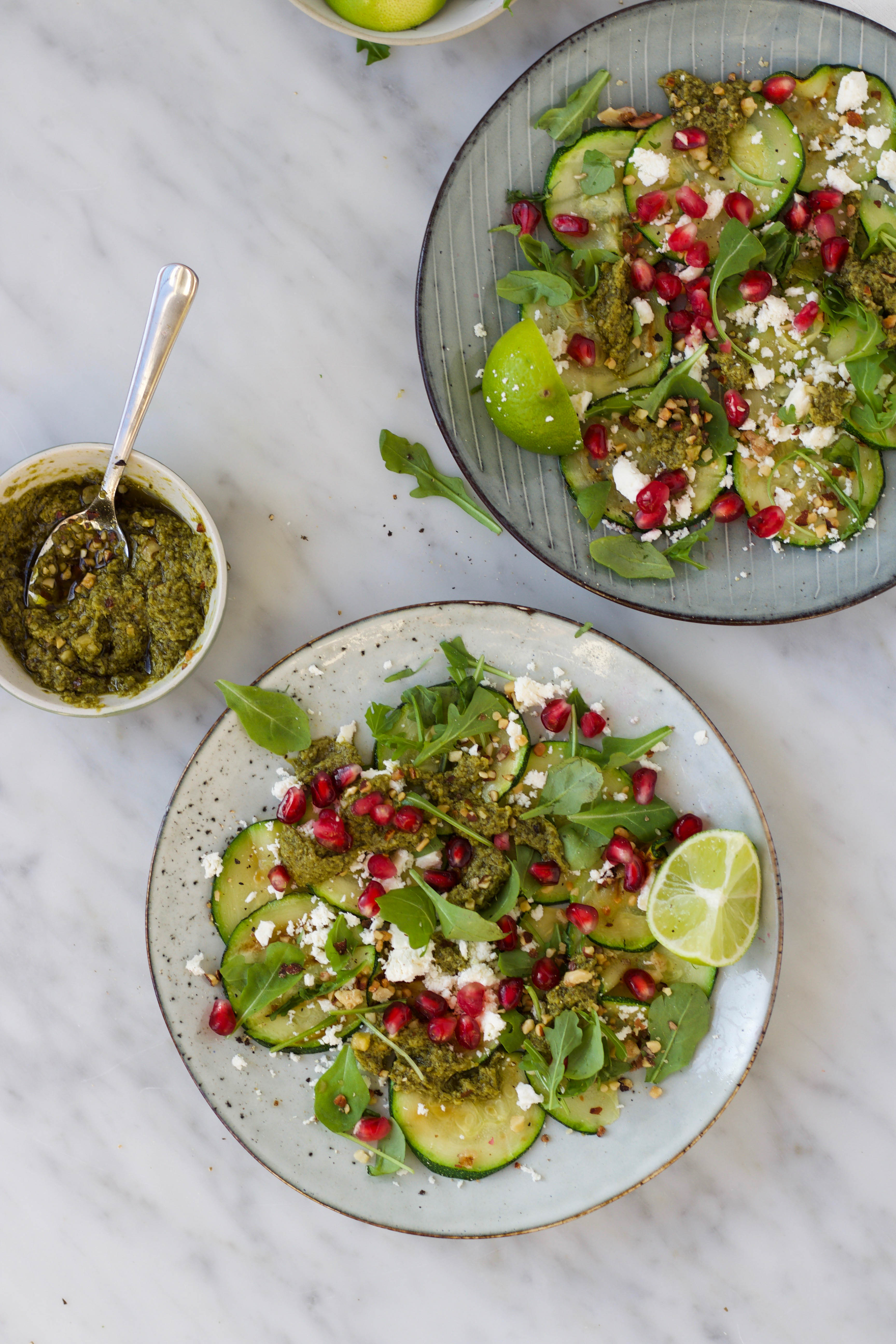 Groene pesto en courgette heb ik altijd al een heerlijk combinatie gevonden. Let wel op dat je niet teveel pesto gebruikt, want deze overheerst snel. Een paar druppeltjes per bord is genoeg. De granaatappel zorgt voor een frisse bite in het gerecht en dat het gerecht er kleurrijk uit ziet.