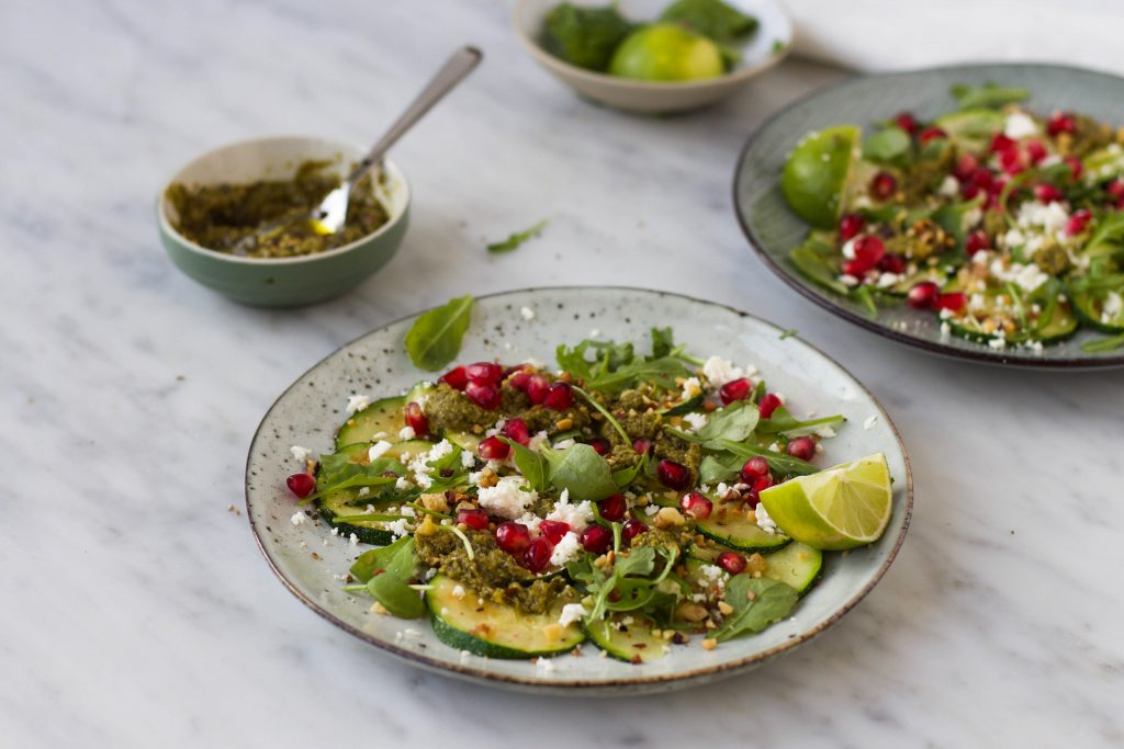 Verkruimel de feta, hak de walnoten grof en haal de granaatappel pitjes uit de granaatappel. Verdeel de feta, nootjes en granaatappel over de courgette. Verdeel nu over ieder bordje een klein beetje pesto, drie kleine bolletjes per bord is al genoeg.