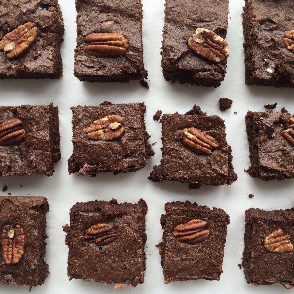 Vet een brownievorm in met kokosolie en verdeel het deeg over de brownievorm. Verdeel wat pecannoten over het deeg. Bak de brownie in het midden van de oven in ongeveer 25 minuten gaar. Controleer met een sateprikker of de brownie gaar is. De brownie is klaar wanneer een satéprikker er schoon en droog uit komt.