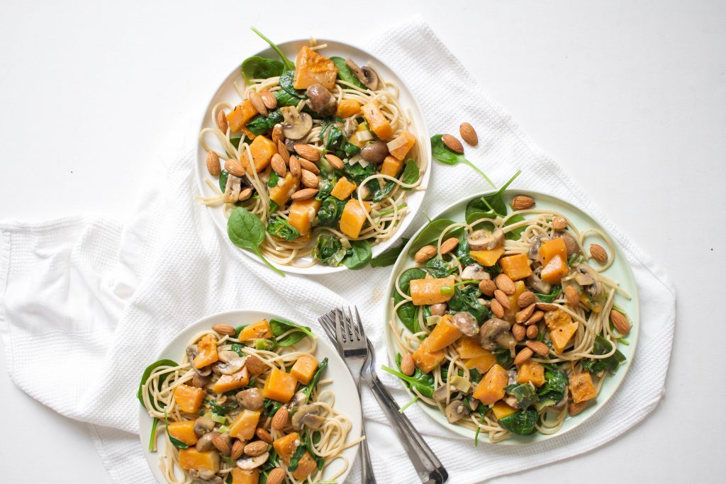 Volkoren spelt spaghetti met pompoen, champignons en spinazie, en een scheutje plantaardige room om de pasta een beetje romiger te maken. Want daar heb je tijdens donkere, koude herfstdagen gewoon zin in!