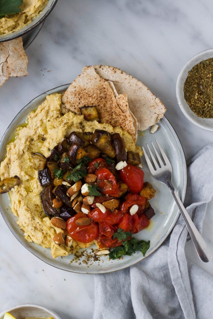 Deze hummus plate met gegrilde aubergine, tomaat, za’atar en amandelen is echt heerlijk als lunch of licht diner! De romige hummus in combinatie met gegrilde aubergine en tomaat is zó smaakvol. Heerlijk met Libanees er bij om te dippen. Lekker, gezond en plantaardig. Dus ben je in de mood voor een heerlijke uitgebreide lunch? Maak deze heerlijke hummus plate met gegrilde groenten voor jezelf!
