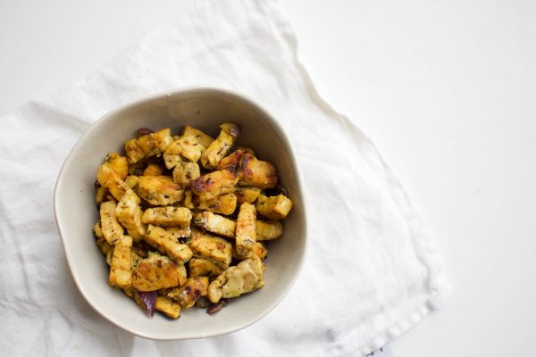 Snipper de ui en hak een teentje knoflook fijn. Snijd de tempeh in reepjes. Doe de tempeh, ui, en knoflook samen met de olijfolie, azijn en de kruiden (tijm, oregano, kurkuma, peper en zout) in een kom. Hussel goed door elkaar en laat een half uurtje staat, zodat alles goed kan intrekken.