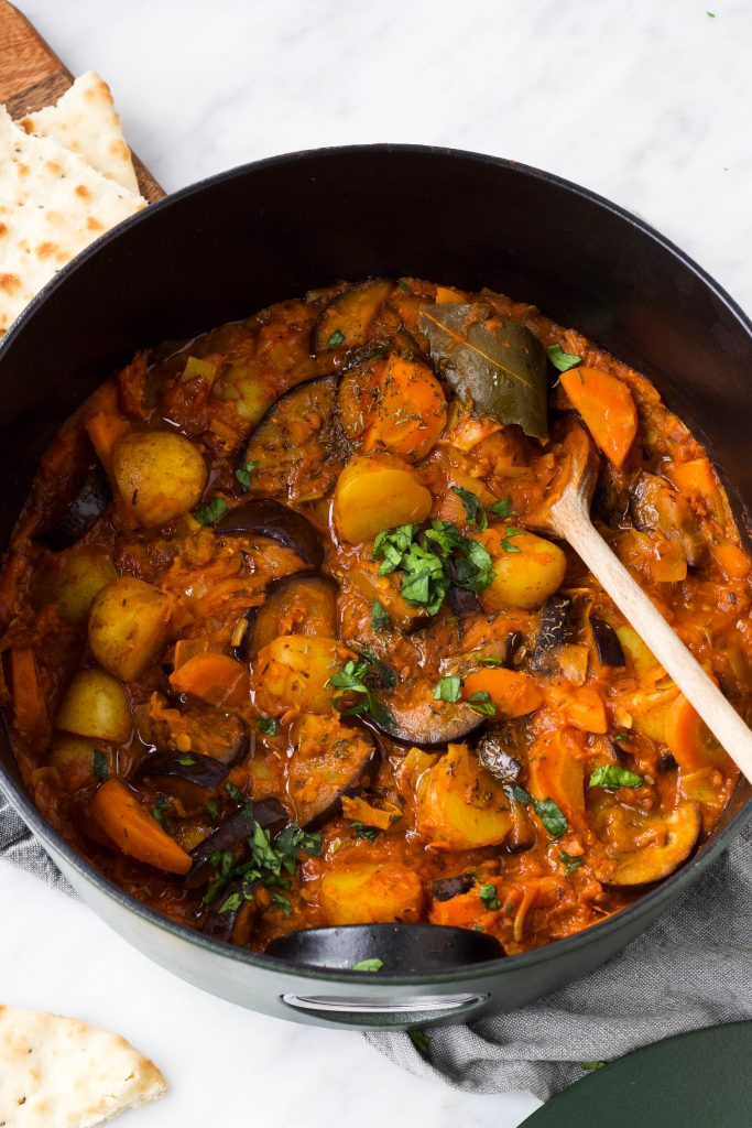 De basis van deze vegetarische stoof is bouillon, tomatenpuree, kruiden en specerijen. Dit brengt het gerecht goed op smaak en maakt ‘m heerlijk kruidig. Laat je daarom niet afschikken door de lange ingredientenlijst, want dit zijn vooral kruiden die je waarschijnlijk al in je keukenkastje hebt staan.