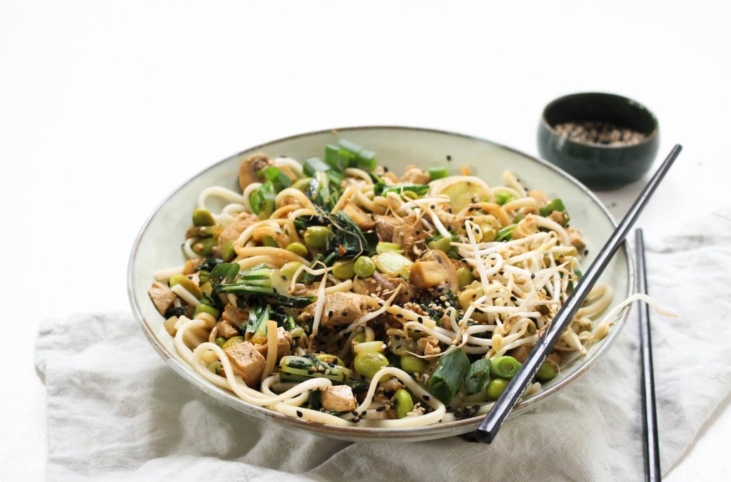 Schep de noedels en gewokte groenten met tofu op de borden. Garneer met nog wat sesamzaadjes en eventueel verse koriander.